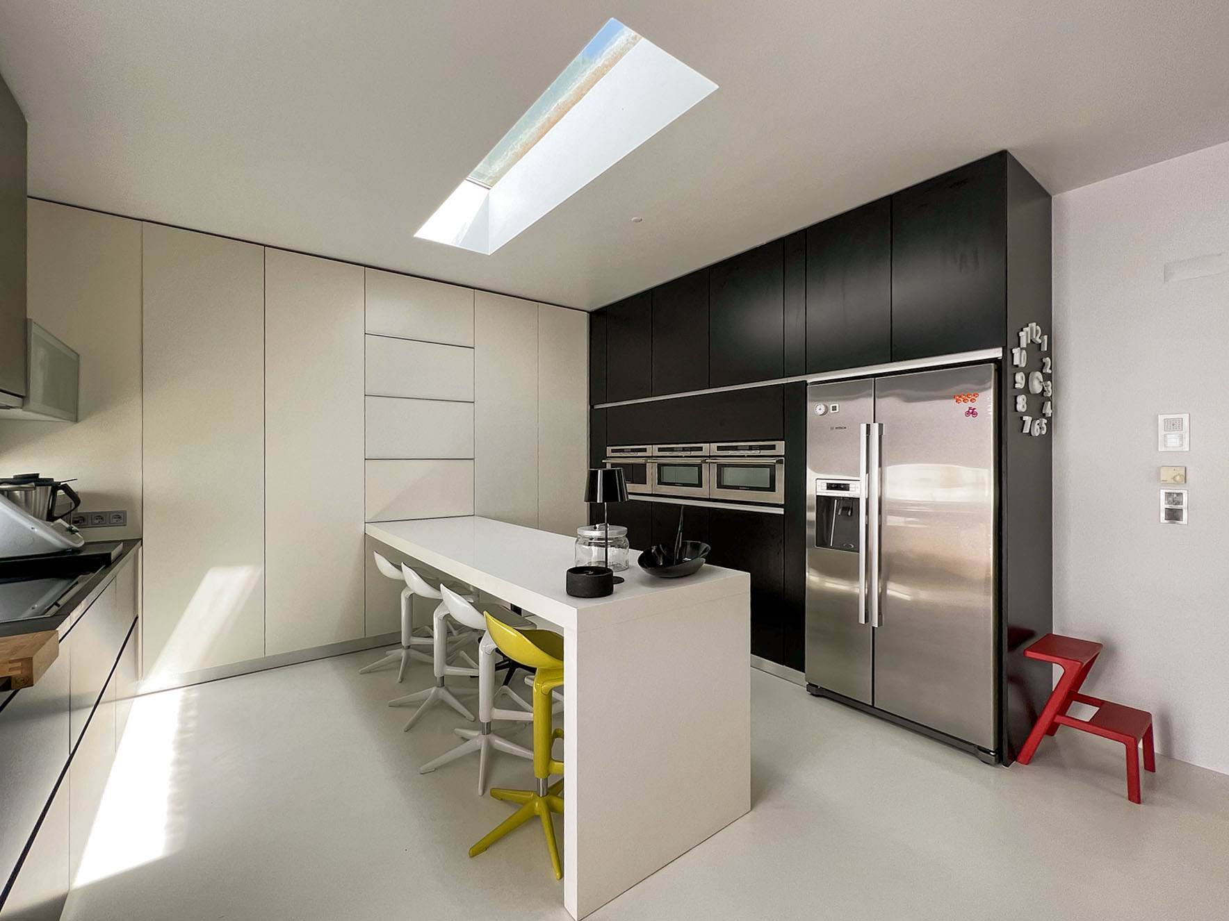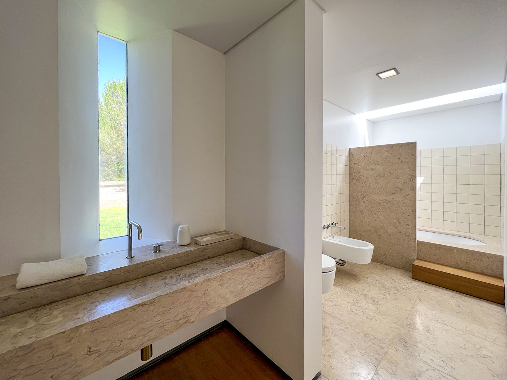 No piso de cima encontramos uma suite, com closet e zonas de estar e de escritório autónomas, com muito espaço e vistas panorâmicas para a piscina.